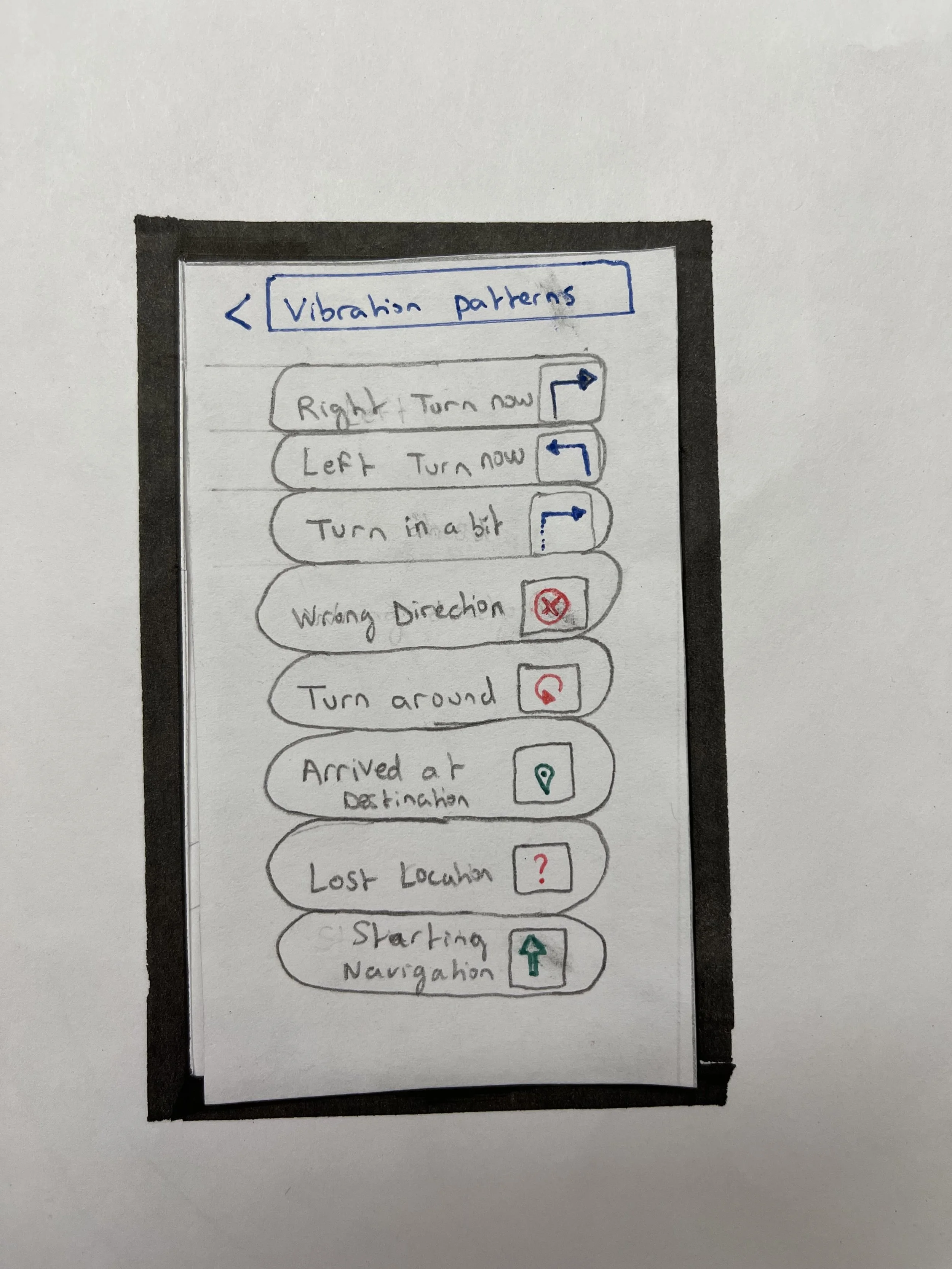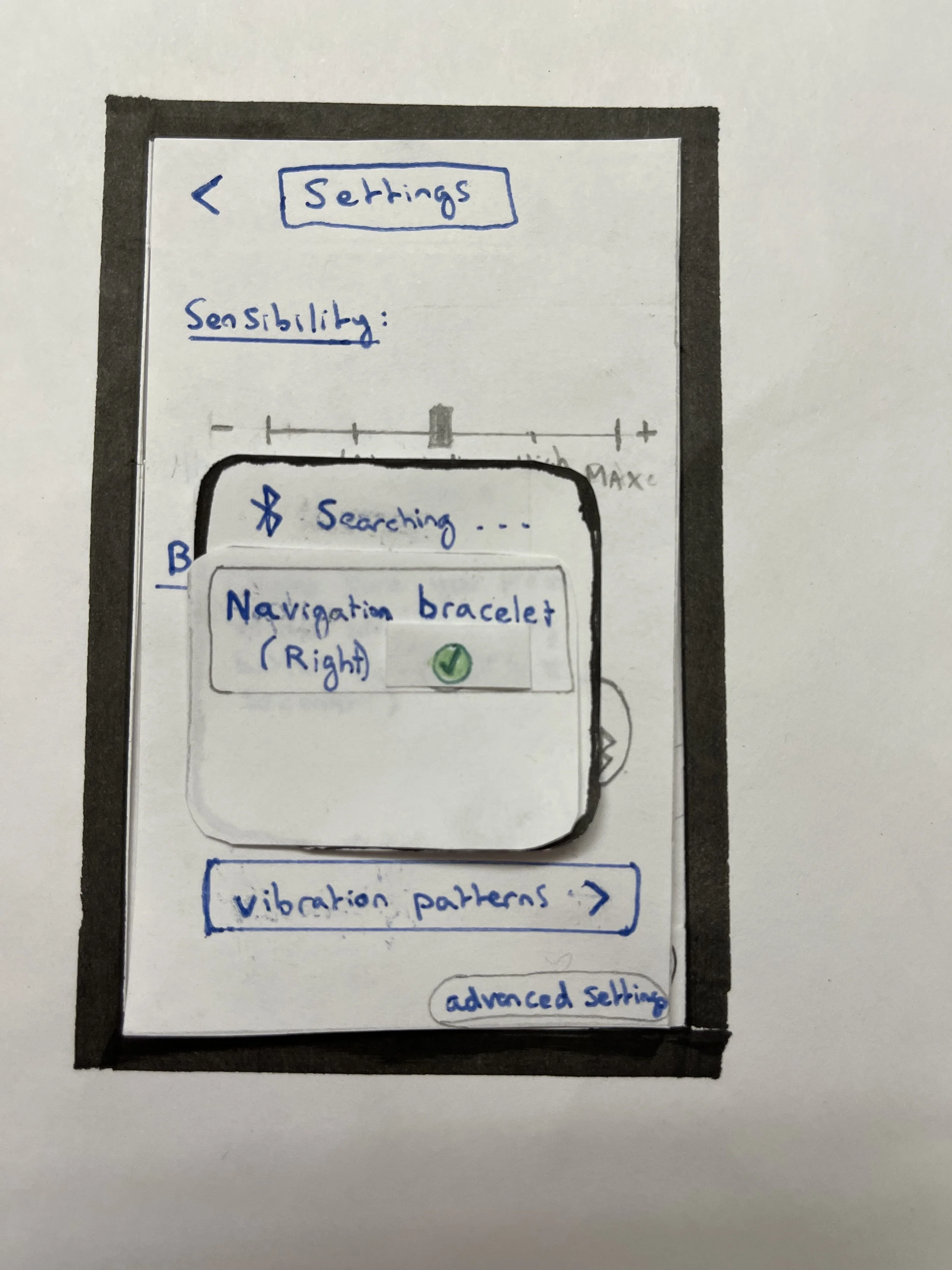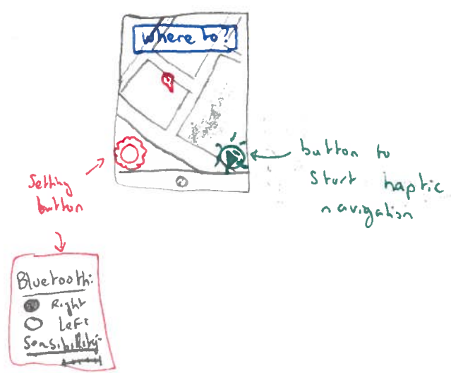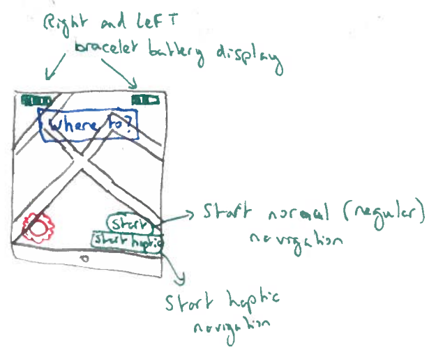 From the sketches for the UI, we realised that the actual UI for any of the navigational wearable devices we sketched, would be fairly straightforward.