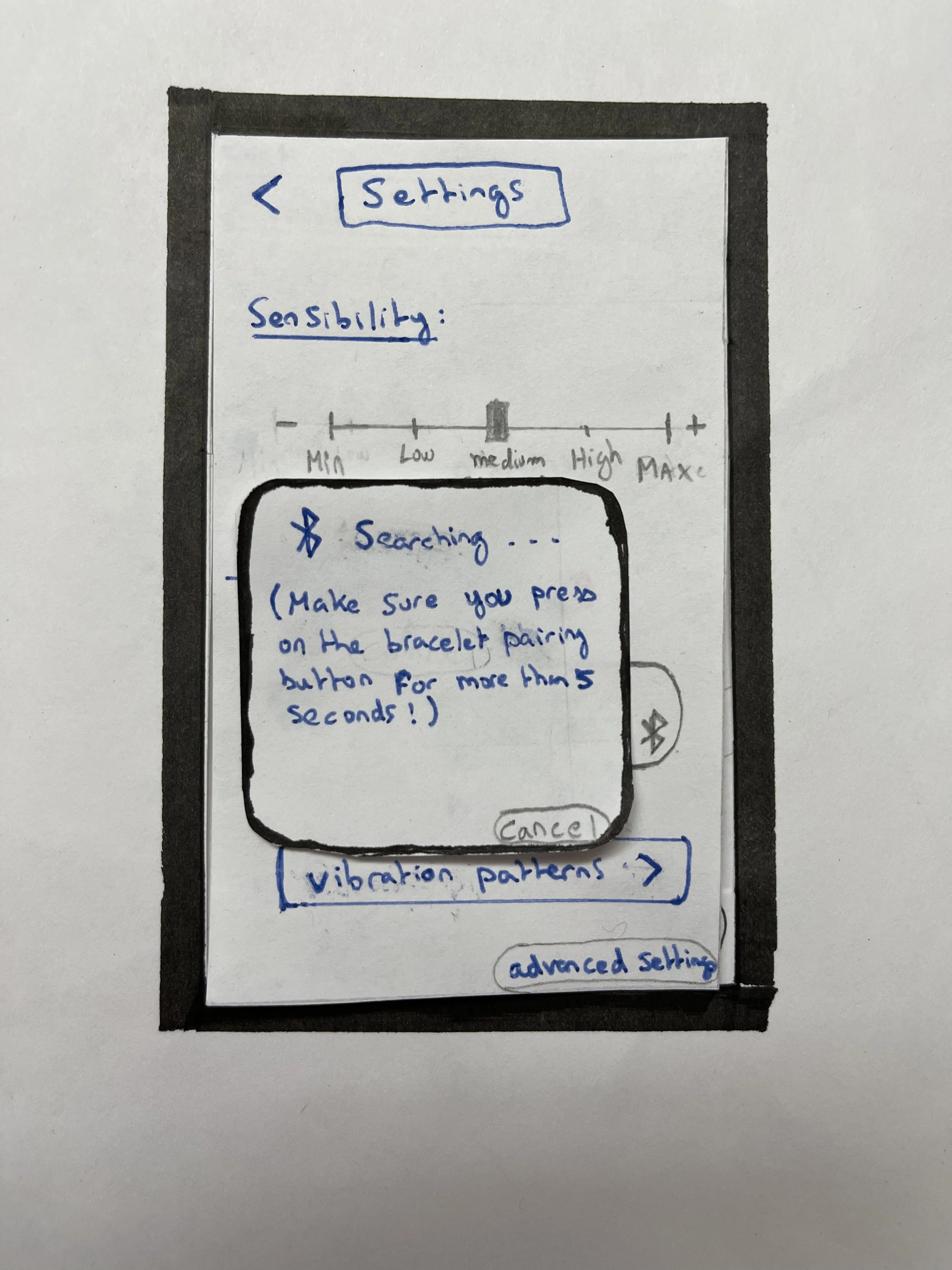 - [For bluetooth connected prototypes:] A bluetooth pairing functionality inside of the settings menu.