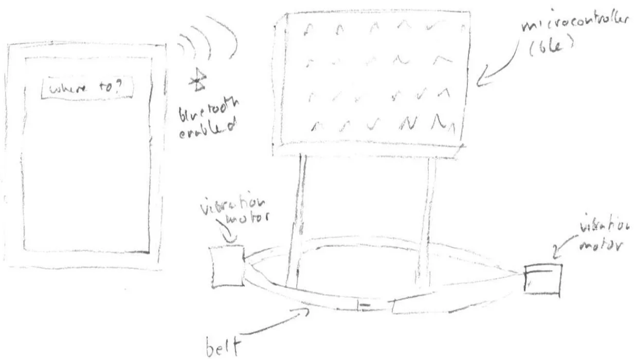 From the preliminary sketches, we discussed the different functionalities and features that some design concepts offered in comparison with the functionalities we thought were the most important when thinking about non-visual interfaces for navigating. For example, we discarded the sketches that involved requiring the user to have a portable charger to power the system that we were implementing. This decision came from the fact that we valued significantly the importance of portability, thus of having a small compact system, and that meant it was ready on the go.