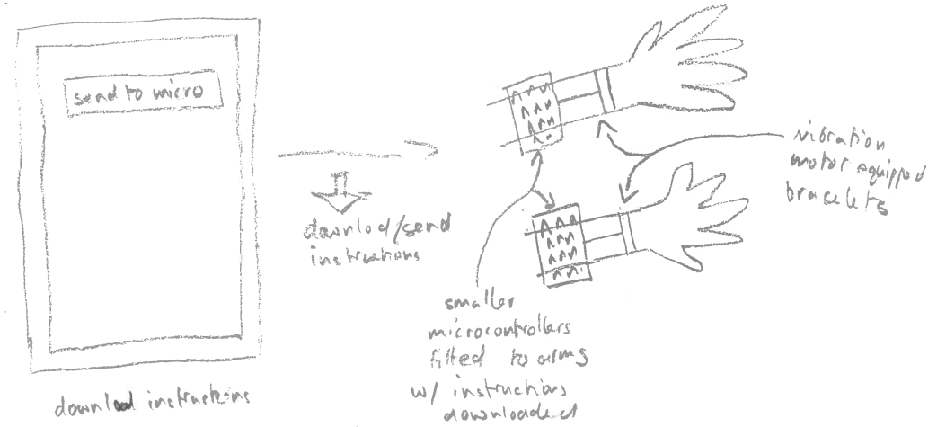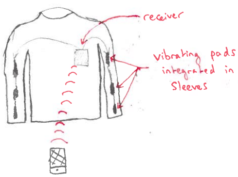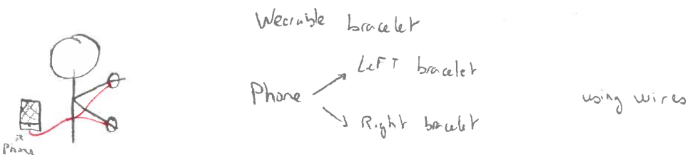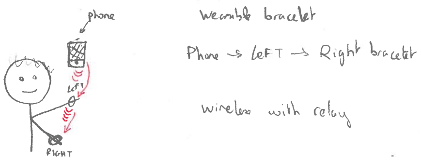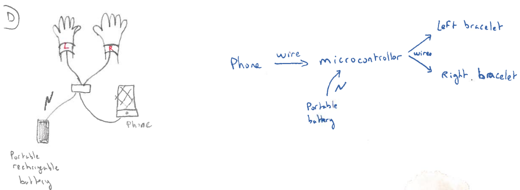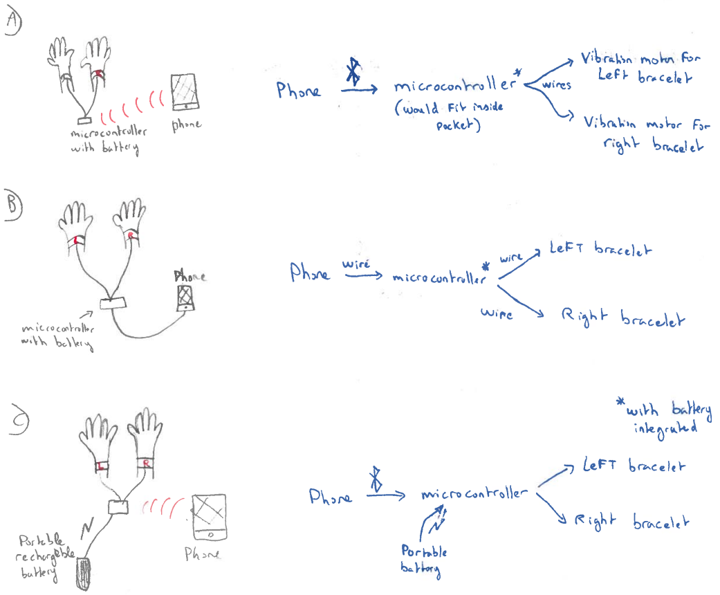 This prototype provides a natural mapping for navigation with the use of 2 vibrating patches that can be attached to bracelets connected by wire to a single microcontroller, itself connected by wire to the user's phone. The motivation for this prototype comes from two main factors. Firstly, that no bluetooth is required which we believe could benefit the duration of the phone battery as well as the battery running the microcontroller and the vibration motors. Secondly, having removable patches could possibly allow for more flexibility in the positioning of the patches, which could be interesting if we wanted to develop different attaching means for these patches (e.g on a belt). Furthermore, this prototype also stood out simply because sometimes connecting devices by bluetooth can be a bother to users with less “technologic” knowledge/abilities (Typically but not restricted to, older generations).