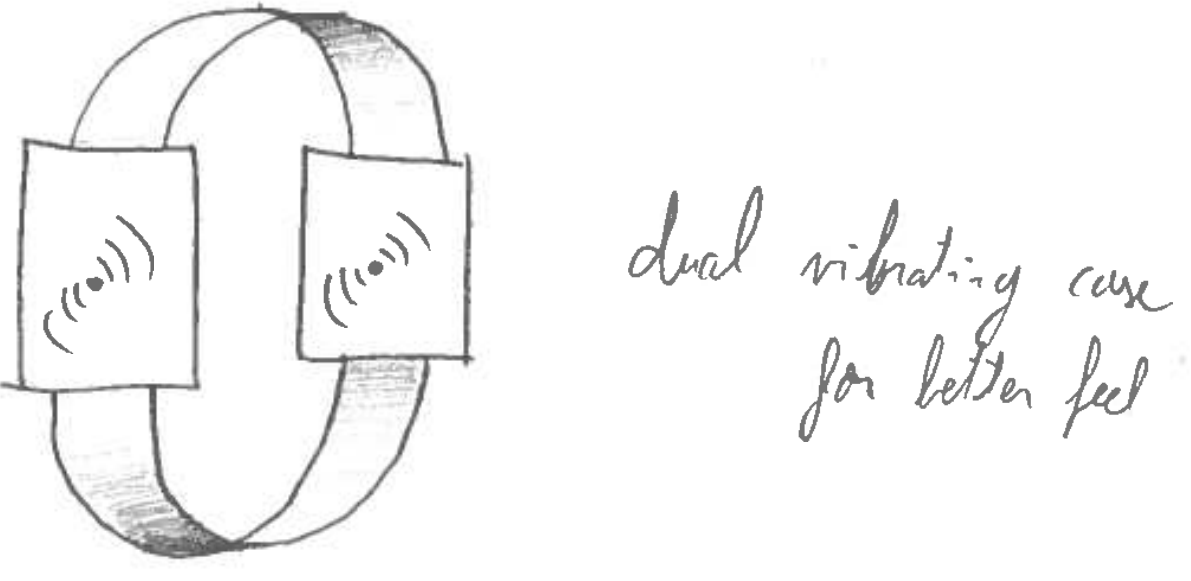 All three prototypes involve the use of two vibrating devices (Left/Right) in an attempt to provide a natural mapping in the context of navigation. Note that to simulate these vibrations, the test facilitator will tap the user near the areas where the devices are worn.