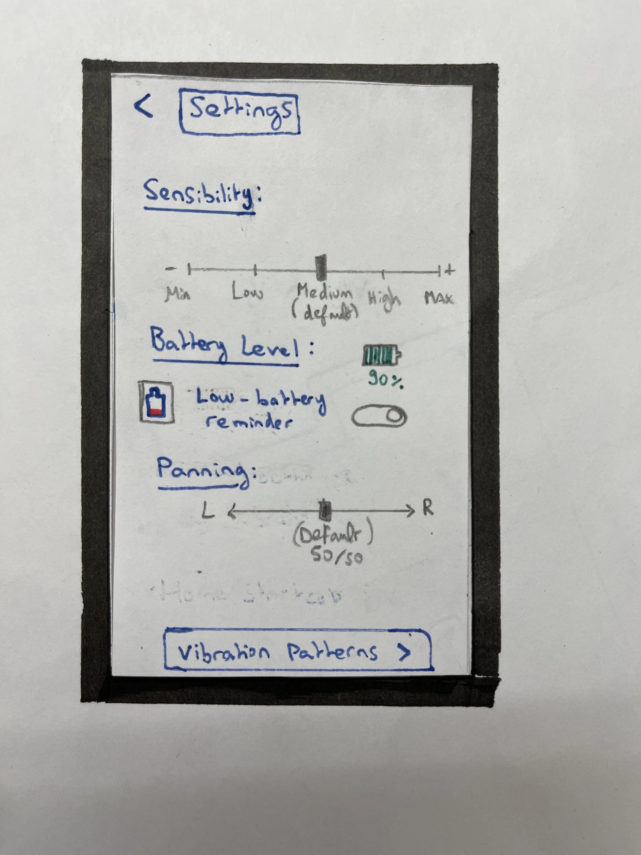 - A settings menu specific to the wearable devices (vibration sensibility, Left-Right panning, option to receive a Low-Battery reminder, a list of the vibration patterns with their corresponding indication for new users)