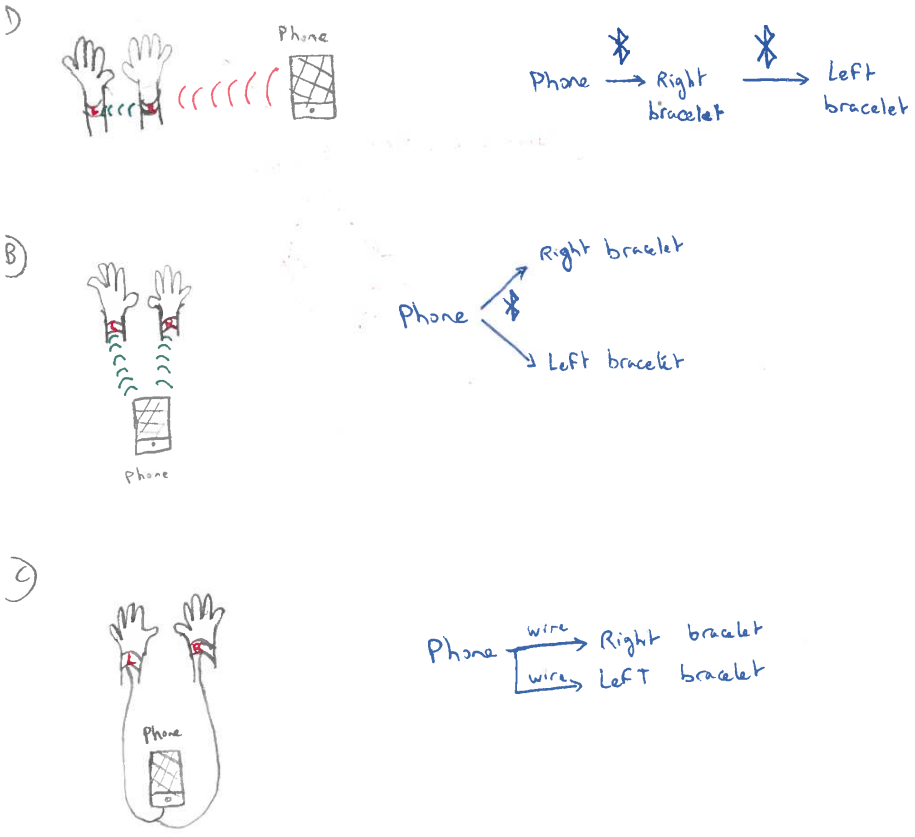 This prototype is similar to the previous prototype in its user functionalities and design concept, however it allows for a completely wireless system, as the user’s phone communicates through bluetooth to each microcontroller on each bracelet. Furthermore, the vibrating motors and microcontrollers are integrated in the bracelet, which allows to reduce the size of the bracelet significantly and make it lighter and less bulky. It allows for a more abstracted system by removing the need for the user to connect an additional component (the microcontroller) separately to each bracelet. Furthermore, the removal of the wires makes it more convenient to use, as it removes the headache of having wires all over the place (can be a particular nuisance for bad weather such as rain or snow). Similarly, this gives the user freedom on the placement of the bracelet, which may be attached anywhere on their arms or legs.